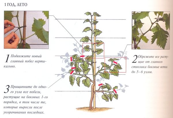 A l'estiu, feu créixer 2 o 3 brots forts i podeu la resta. A la tardor, poda el brot inferior dels dos com a substitut i escurça el superior a 5 o 6 brots; produirà fruits. L'any següent, lliga les branques fructíferes horitzontalment a l'enreixat, apuntant-les en direccions oposades. Lliga els brots verticalment a mesura que creixen.